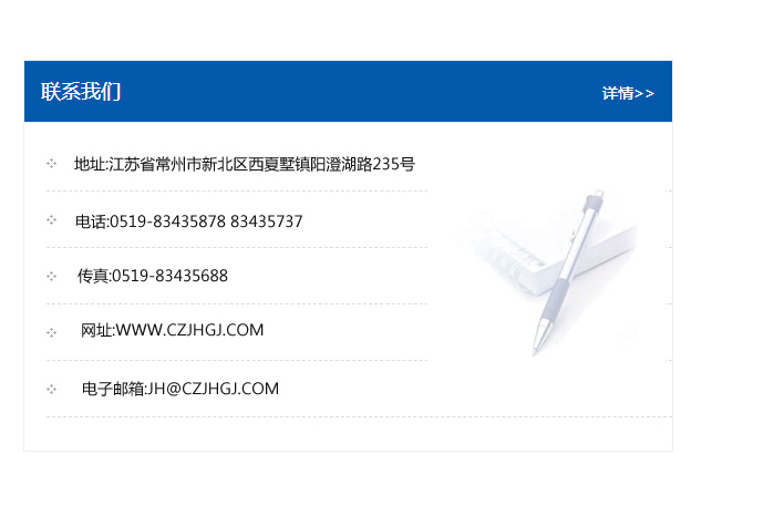 地址:常州市新北區友邦商務大廈1幢16、17層  電話:0519-85101652  傳真:0519-85112595  郵編:213022  網址:www.cz-jiayue_cn.51gaia.com  郵箱:xiajifengaa@163.com